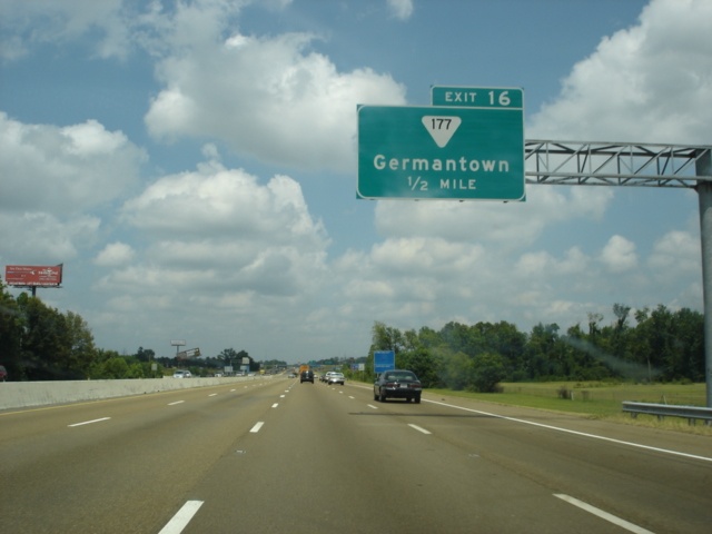 Interstate 40 East approaching Exit 16 - Tennessee Secondary 177 - 1/2 mile. Germantown (pop. 40,203) is seven miles to the south. (Photo taken 7/5/05) |