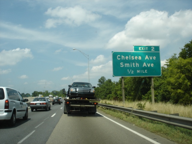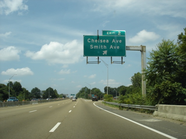 Interstate 40 East at Exit 2 - Chelsea Avenue/Smith Avenue. Both avenues run east-west. Smith Avenue is not much more than a connector between U.S. 51/Tennessee 3 and Interstate 40. Chelsea Avenue runs between North 2nd Street and Jackson Avenue (Tennessee 14). (Photo taken 7/5/05) |