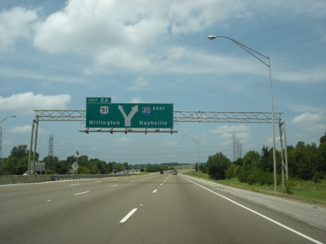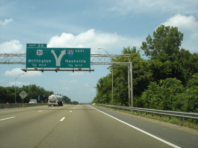 Interstate 40 East at Exit 2A - U.S. 51 - Millington. A 13 mile drive separates Interstate 40 from Millington. When Interstate 69 is built in Tennessee, that interstate will exit the Memphis beltway here and follow U.S. 51 North. (Photo taken 7/5/05) |