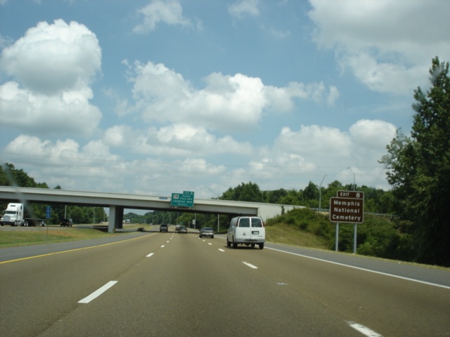 A fourth lane is added to eastbound as we draw closer to U.S. 51. The federal highway enters Memphis from Mississippi as Elvis Presley Boulevard and departs the city on Danny Thomas Boulevard. (Photo taken 7/5/05) |