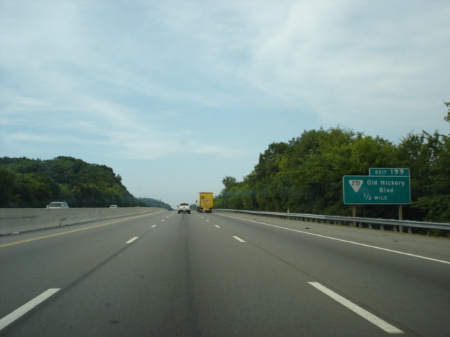 Interstate 40 East approaching Exit 221B - Old Hickory Boulevard - Next Right. The diamond interchange is 1/4 mile away. (Photo taken 7/5/05) |
