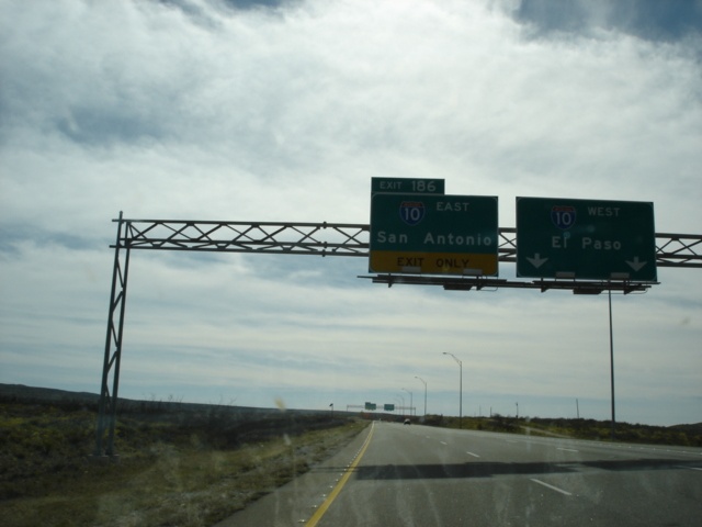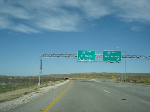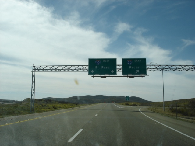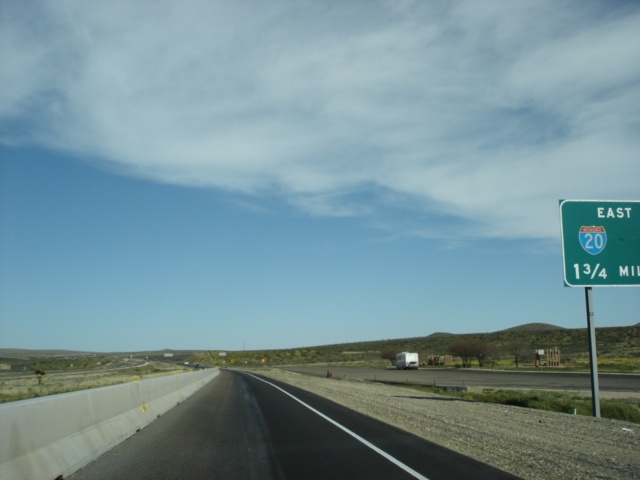 Interstate 10 West at unmarked Exit 187 - Interstate 20 East - Pecos. (Photo taken 3/17/05) |
