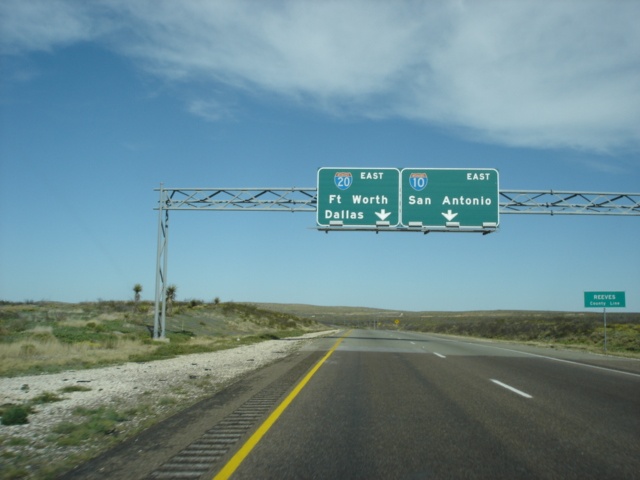 Now at the Jeff Davis/Reeves county line, and 1/2 mile from the split of Interstate 10 and Interstate 20. Either way you go here, a 400-plus mile drive is ahead to get to any one of the three cities mentioned here. (Photo taken 3/17/05) |