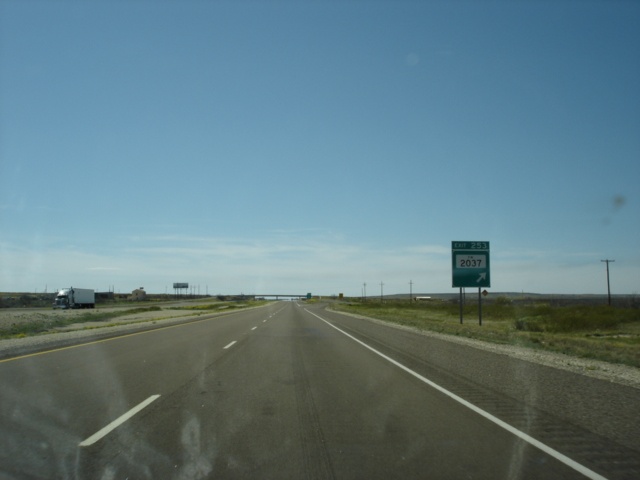 Interstate 10 West and U.S. 67 South approaching Exit 253 - Ranch to Market Road 2037 - 3/4 mile. (Photo taken 3/17/05) |