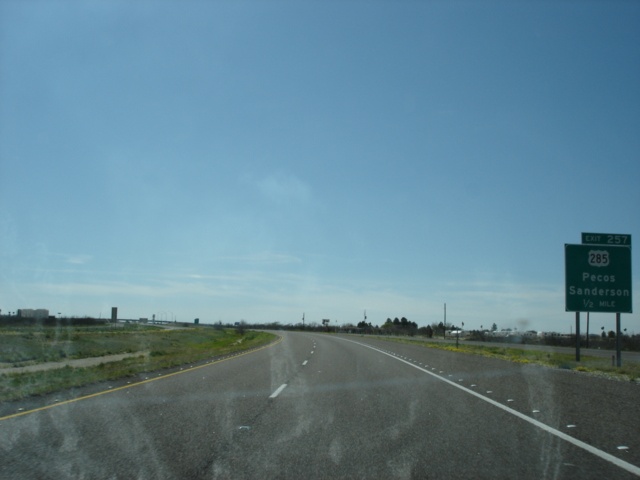 Interstate 10 West and U.S. 67 South at Exit 257 - U.S. 285 - Pecos/Sanderson. Pecos is located 50 miles northwest of Fort Stockton. U.S. 285 meets its southern terminus in Sanderson, 66 miles southeast of Fort Stockton. (Photo taken 3/17/05) |