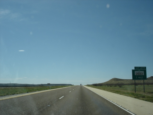 Interstate 10 West at Exit 277 - Farm to Market Road 2023. Use FM 2023 South as an alternate route to U.S. 285. (Photo taken 3/17/05) |
