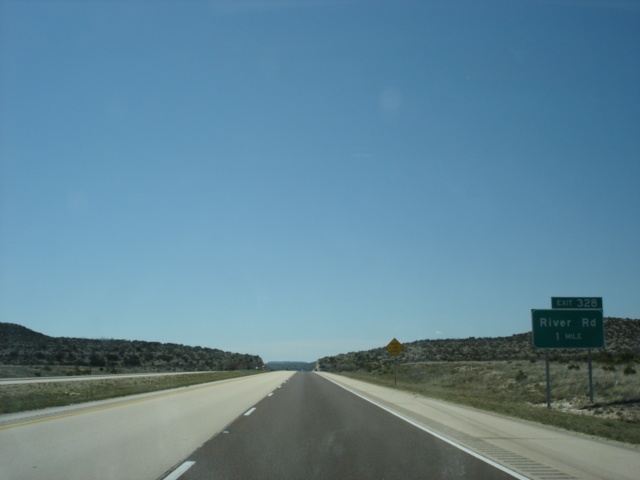 Interstate 10 West at Exit 328 - River Road. This is the final westbound exit not in Pecos County for 100 miles. (Photo taken 3/17/05) |