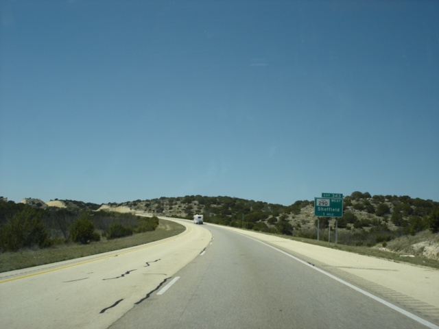 Interstate 10 West at Exit 343 - Texas 290 West - Sheffield. The state highway connects back to the interstate at Exit 325. (Photo taken 3/17/05) |