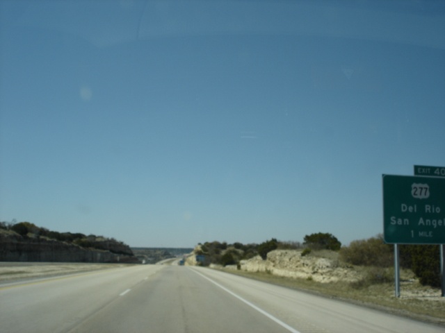 Interstate 10 West at Exit 400 - U.S. 277 - Del Rio/San Angelo. The city by the river is 87 miles to the south and is home to 33,867. There is not too much to speak of between Sonora and Del Rio. (Photo taken 3/17/05) |