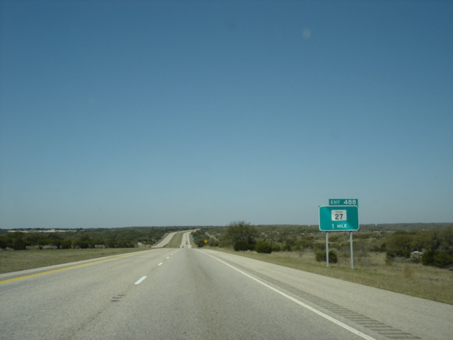 Interstate 10 West approaching Exit 488 - Texas 27 - 1 mile. This marks the western terminus of the state highway connecting Ingram, Kerrville, Center Point, and Comfort. It has stayed close to Interstate 10 throughout its length. (Photo taken 3/17/05) |