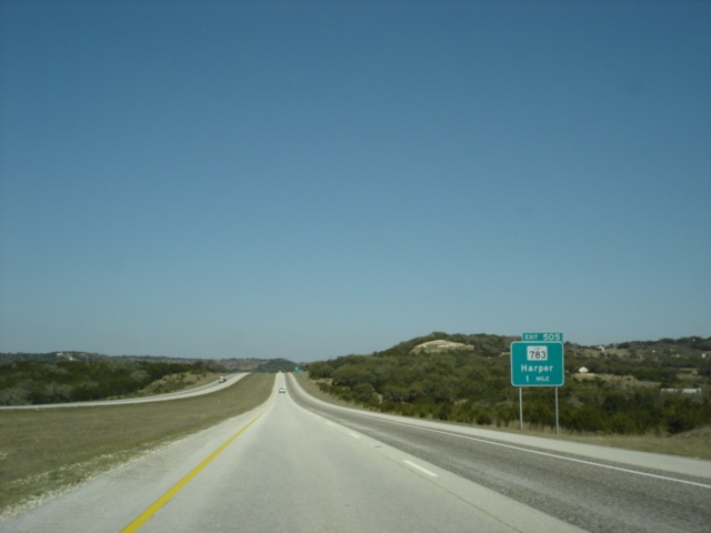 Interstate 10 West at Exit 505 - Farm to Market Road 783 - Harper. The town is located 18 miles to the north along U.S. 290. (Photo taken 3/17/05) |