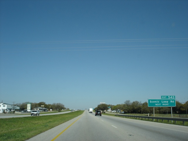 Interstate 10 West and U.S. 87 North reach Exit 543, serving Boerne Stage Road, Cascade Caverns Road, and Scenic Loop Road. (Photo taken 3/17/05) |