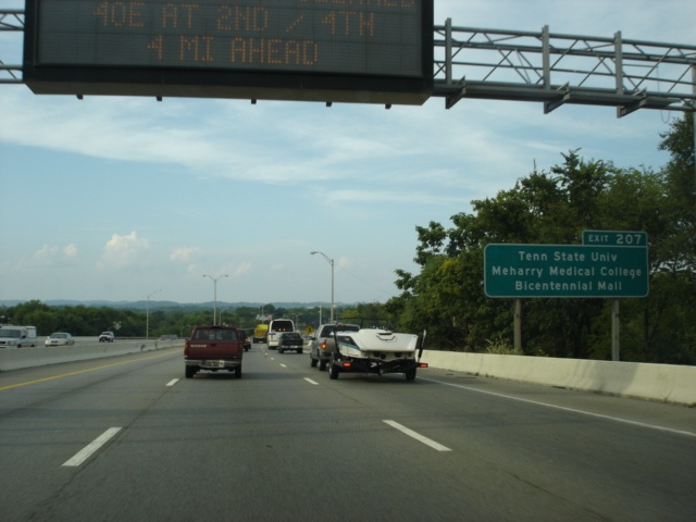 The next exit, Exit 207, serves Jefferson Street. The top of this picture shows a variable message sign, which is warning of a traffic jam ahead due to a stalled car. Use Exit 207 to Tennessee State University, Meharry Medical College, and Bicentennial Mall, which is actually a 19-acre park located near the state capitol building. (Photo taken 7/5/05) |