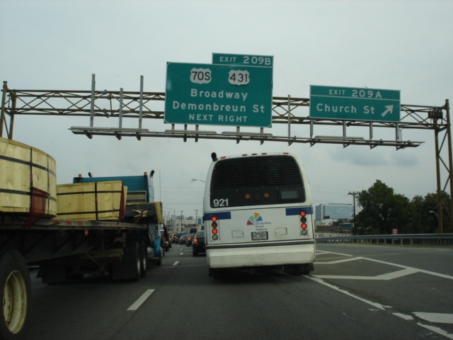 Church Street passes over the interstates as Exit 209B for U.S. 70S and U.S. 431 departs the freeway. U.S. 70 runs along the frontage roads on each side of the freeway between Exit 209 and Exit 209B. (Photo taken 7/5/05) |