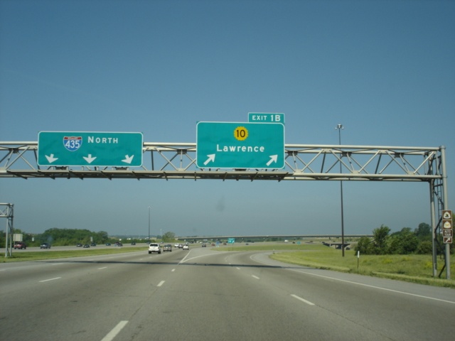Interstate 435 West approaching Exit 1B - Kansas 10 - 1/4 mile. Use Kansas 10 West as an alternate to the Kansas Turnpike between Kansas City and Lawrence. (Photo taken 5/21/05) |