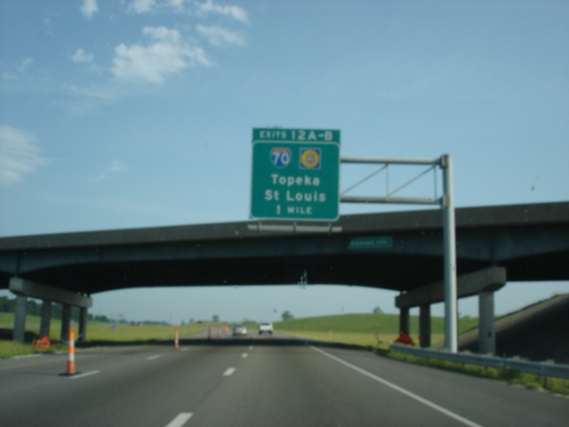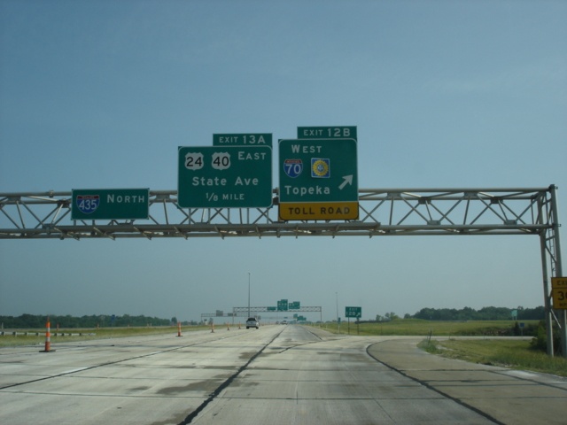 off-ramp from U.S. 24 East, U.S. 40 East, and U.S. 73 South provides three choices. The first option is a ramp to westbound Interstate 70 and the Kansas Turnpike, which departs in one-half mile. Also visible here is an diagrammatical sign for Interstate 435 South at Interstate 70. (Photo taken 5/22/05) |