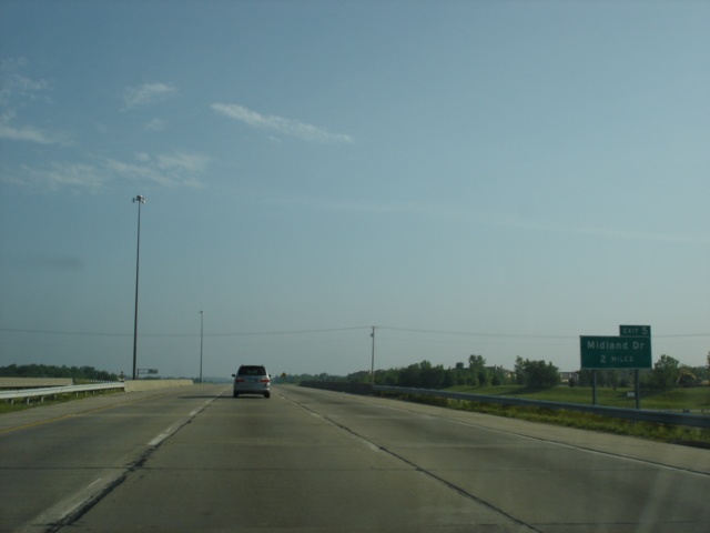 Interstate 435 North approaching Exit 5 - Midland Drive - 2 miles. The upcoming exit is near the Shawnee-Lenexa city limit boundary. (Photo taken 5/22/05) |
