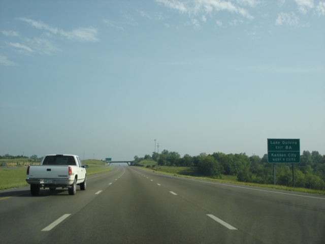 Exit 82 - Quivira Road - 3/4 mile. The c/d lane ramp to U.S. 69 South is to the right. (Photo taken 5/22/05) |