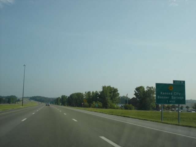 Interstate 435 North approaching Exit 9 - Kansas 32 - 1 mile. Kansas 32 is another route between Lawrence and Kansas City. (Photo taken 5/22/05) |