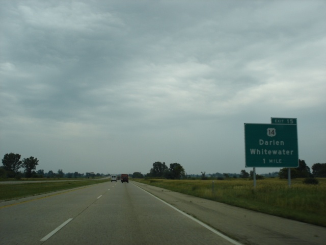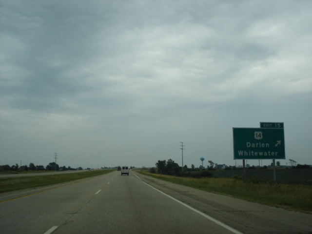 Interstate 43 North at Exit 15 - U.S. 14 - Darien/Whitewater. Whitewater is located 18 miles to the north via U.S. 14 West and Wisconsin 89 North. (Photo taken 7/12/05) |