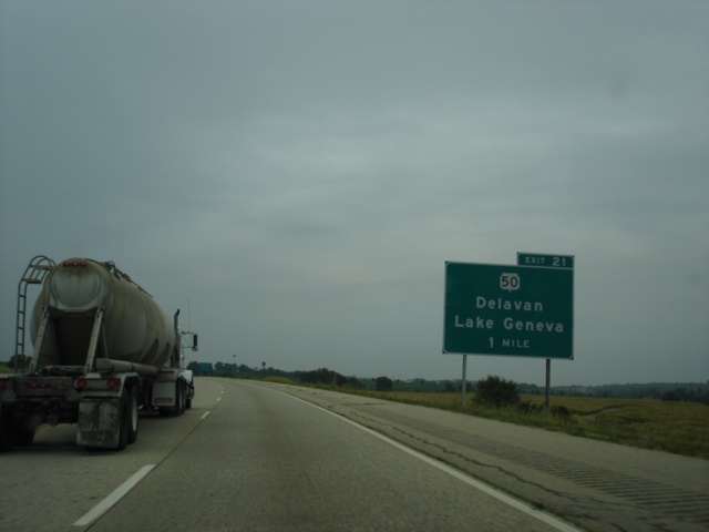 Interstate 43 North approaching Exit 21 - Wisconsin 50 - 1 mile. Wisconsin 50 travels 44 miles from Wisconsin 11 in Delavan to Wisconsin 32 in Kenosha. (Photo taken 7/12/05) |