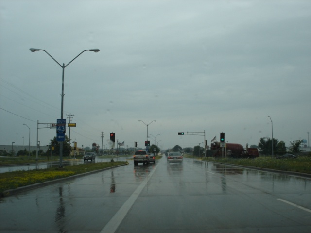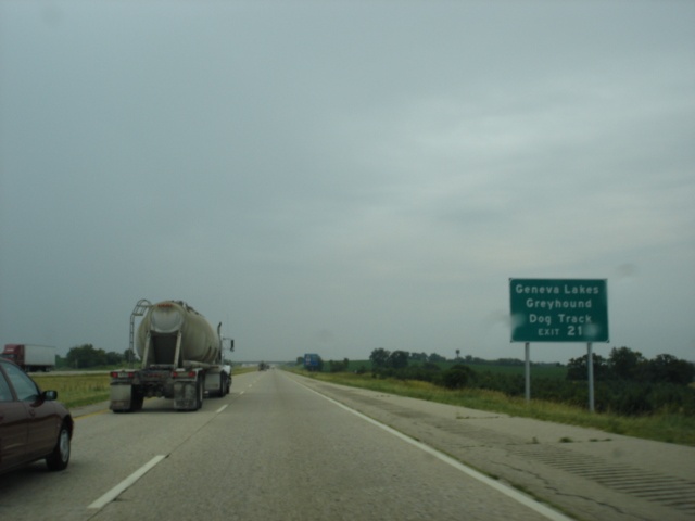 Use Exit 21 to the Geneva Lakes Greyhound Dog Track. A brief heavy downpour of rain started just ahead. (Photo taken 7/12/05) |