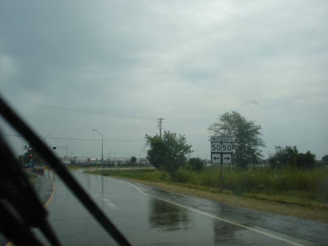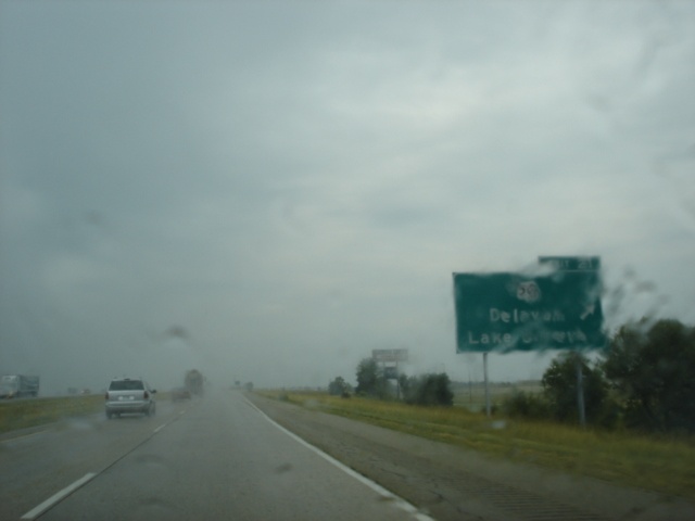 Rain-blurred picture of Interstate 43 North at Exit 21 - Wisconsin 50 - Delavan/Lake Geneva. Lake Geneva is 12 miles to the east. (Photo taken 7/12/05) |