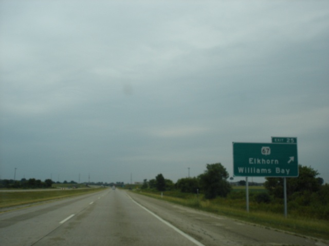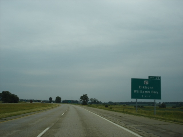 Interstate 43 North at Exit 25 - Wisconsin 67 - Elkhorn/Williams Bay. The city of Elkhorn (pop. 7,305) is one mile to the north, and the village of Williams Bay (pop. 2,415) is five miles to the south along Lake Geneva. (Photo taken 7/12/05) |