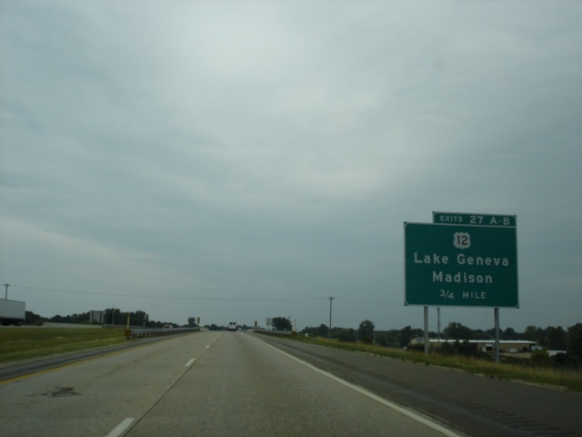 Interstate 43 North approaching Exits 27A-B - U.S. 12 - 3/4 mile. U.S. 12 runs along a freeway from Elkhorn to the Illinois state line, a distance of 20 miles. (Photo taken 7/12/05) |
