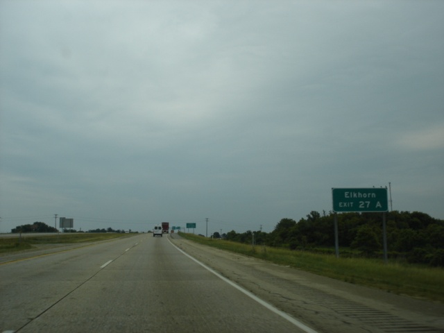 Despite the fact that Elkhorn is on the northwest corner of the interchange, use Exit 27A (U.S. 12 East) to the nearby Walworth County NN exit to the city. U.S. 12 bypasses Elkhorn to its east and has no other interchanges to the city. (Photo taken 7/12/05) |