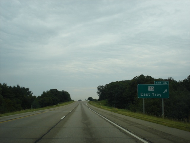 Interstate 43 North at Exit 36 - Wisconsin 120 - East Troy. East Troy (pop. 3,830) is just to the north. (Photo taken 7/12/05) |