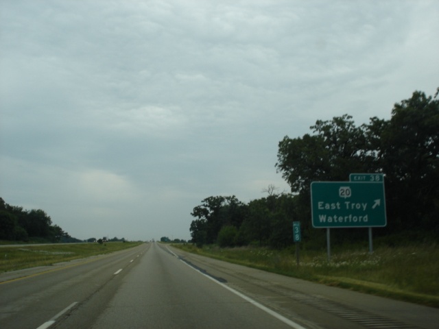 Interstate 43 North at Exit 38 - Wisconsin 20 - East Troy/Waterford. The town of Waterford (pop. 5,938) and the village of Waterford (pop. 4,048) are 10 miles to the east. (Photo taken 7/12/05) |