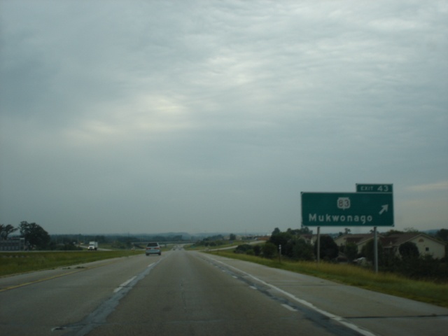 Interstate 43 North at Exit 43 - Wisconsin 83 - Mukwonago. The town of Mukwonago is home to 6,868 residents and is just to the north. (Photo taken 7/12/05) |
