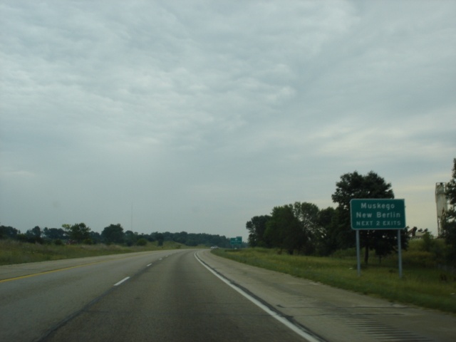 Use either of the next two exits to the city of Muskego (pop. 21,397) and to the city of New Berlin (pop. 38,220). The interstate enters the Milwaukee metropolitan area at this point. (Photo taken 7/12/05) |
