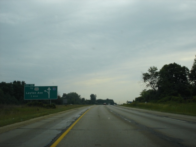Interstate 43 North at Exit 59 - TO Wisconsin 100 - Layton Avenue. The left-side exit leads directly to Layton Avenue, which intersects the north-south Wisconsin 100 in 1.4 miles. South of Interstate 43, Wisconsin 100 also carries U.S. 45. (Photo taken 7/12/05) |