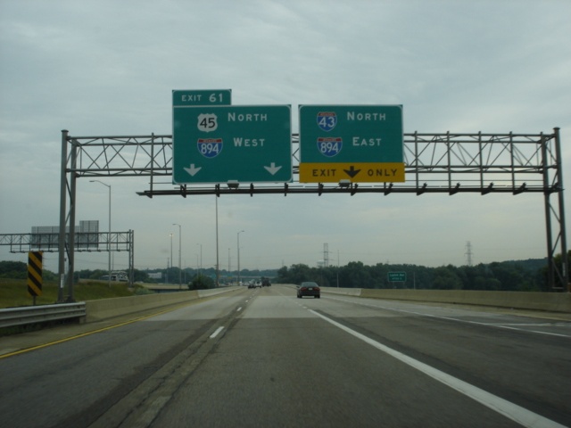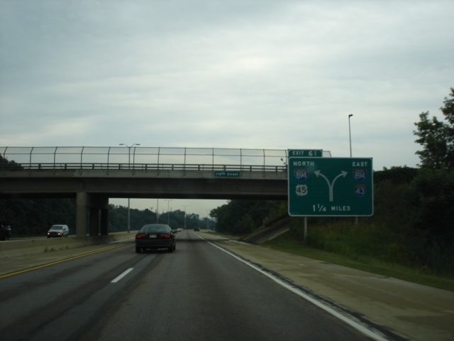 Interstate 43 and U.S. 45 North approaching Exit 61 - Interstate 894/U.S. 45 North - 1/2 mile. Interstate 894 is duplexed with U.S. 45 on its north-south portion, and with Interstate 43 on its east-west section. (Photo taken 7/12/05) |