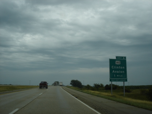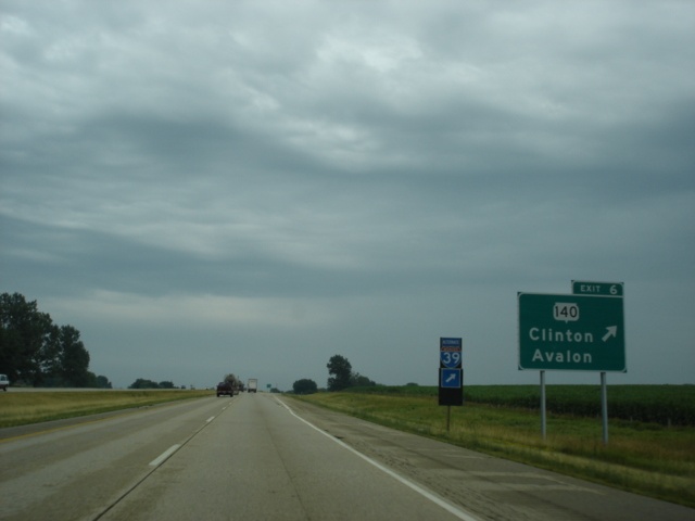 Interstate 43 North at Exit 6 - Wisconsin 140 - Clinton/Avalon. Clinton (pop. 2,162) is just to the south, and Avalon is five miles to the north. (Photo taken 7/12/05) |