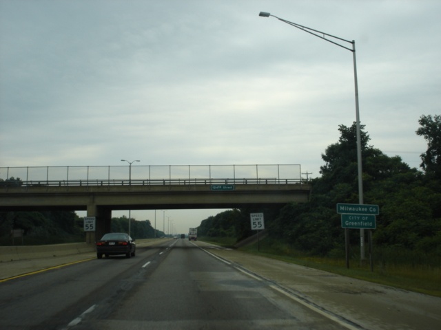 Interstate 43 North enters Milwaukee County and the city of Greenfield at the 124th Street overpass. The speed limit falls to 55. (Photo taken 7/12/05) |