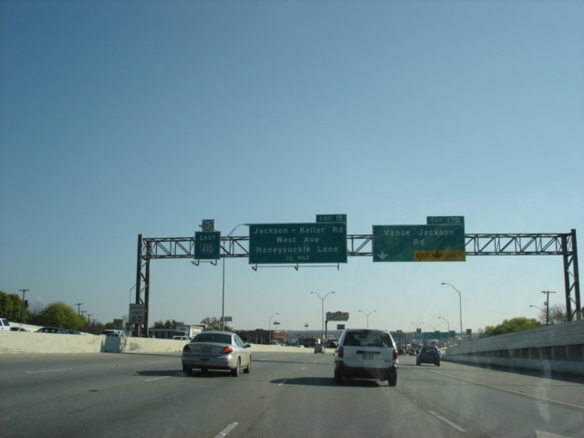 Interstate 410 East approaching Exit 17B - Vance Jackson Road - 1/2 mile, and Exit 18 - Jackson-Keller Road/West Avenue - 3/4 mile. Exit 18 also serves Honeysuckle Lane, but it appears the sign contractors forgot to include that on this particular sign, even though there looks like there is room for it to be added in the future. (Photo taken 3/17/05) |