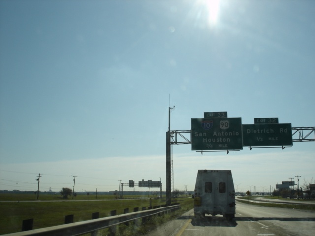 Interstate 410 South approaching Exit 32 - Dietrich Road - 1/2 mile, and Exit 33 - Interstate 10/U.S. 90 - 3/4 mile. (Photo taken 3/17/05) |