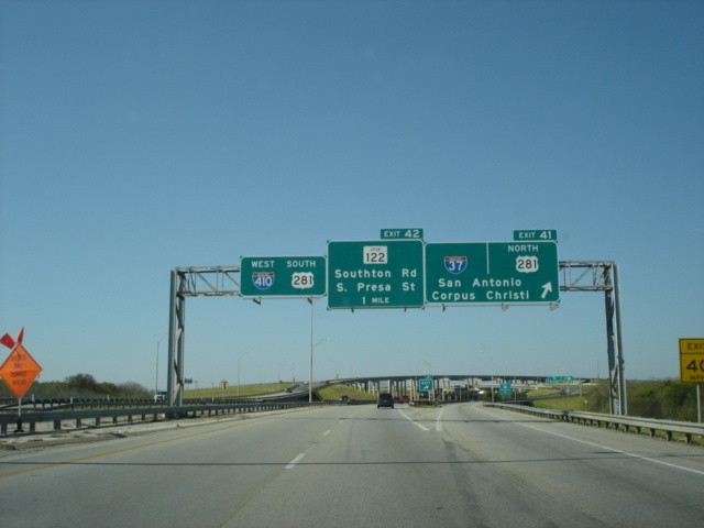 Interstate 410 West and U.S. 281 South at Exit 42 - Spur 122/S. Presa Street/Southton Road. Spur 122 was once part of U.S. 181. (Photo taken 3/17/05) |
