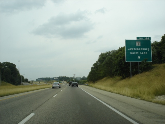Interstate 74 West at Exit 164 - Indiana 1 - Lawrenceburg/Saint Leon. Saint Leon is one mile to the north. Indiana 46 closely parallels Interstate 74 between U.S. 52 and Greensburg. (Photo taken 7/11/05) |