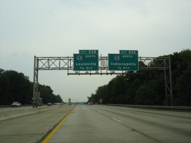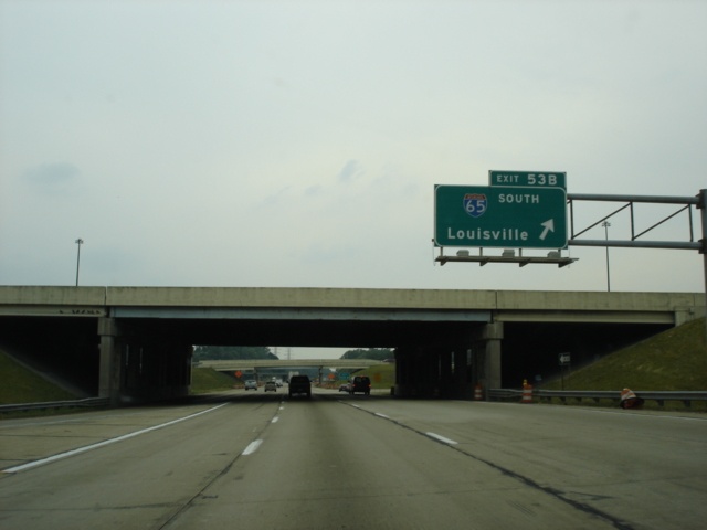 Interstate 74 and Interstate 465 West at Exit 53B - Interstate 65 South - Louisville. Traffic from northbound Interstate 65 comes in from the left. Louisville, Kentucky, is 107 miles to the south. (Photo taken 7/11/05) |