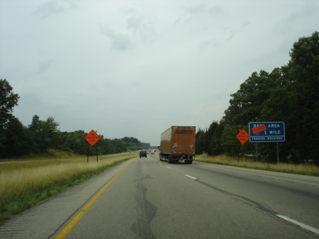 Interstate 74 West approaching the closed Ripley County rest area - 1 mile. It reopened as a welcome center and rest area in November 2005. (Photo taken 7/11/05) |