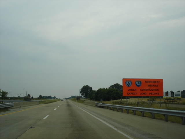 This sign posted just past Fairland Road informs motorists of major construction on Interstate 80 and Interstate 94 in northwest Indiana. We are still about 180 miles from the construction at this point. (Photo taken 7/11/05) |