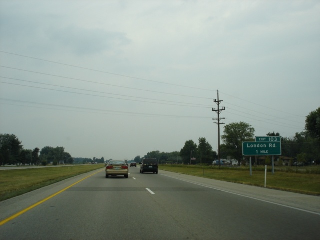 Interstate 74 and U.S. 421 North approaching Exit 103 - London Road - 1 mile. Two interchanges remain before the interstate enters Marion County and Indianapolis. (Photo taken 7/11/05) |