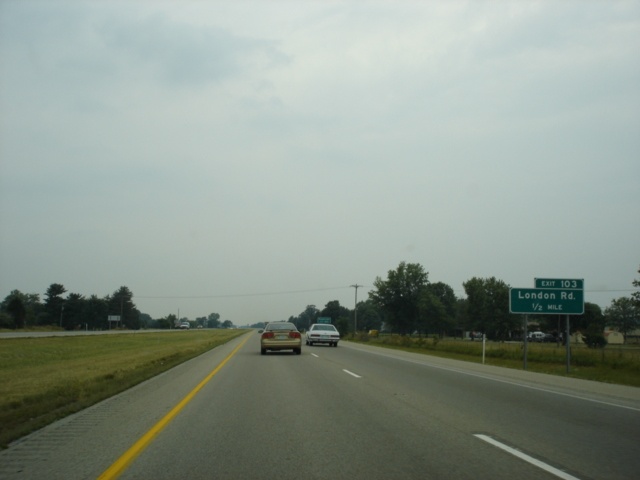 Interstate 74 West and U.S. 421 North approaching Exit 103 - London Road - 1/2 mile. (Photo taken 7/11/05) |