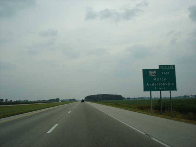 Interstate 74 West and U.S. 421 North approaching Exit 119 - Indiana 244 East - 1 mile. Indiana 244 is 19.5 miles long and connects Interstate 74 to U.S. 52 in Andersonville. (Photo taken 7/11/05) |
