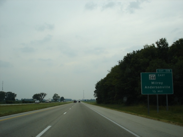 Interstate 74 West and U.S. 421 North approaching Exit 119 - Indiana 244 East - 1/2 mile. Milroy is 12 miles to the east near the intersection of Indiana 244 and Indiana 3. (Photo taken 7/11/05) |