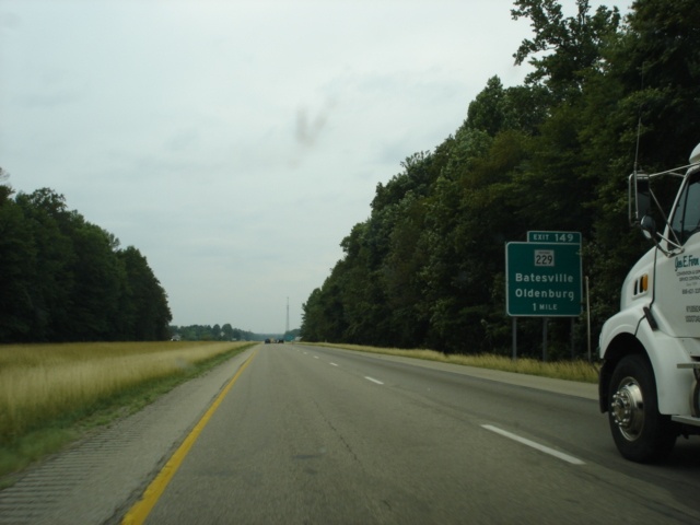Interstate 74 West approaching Exit 149 - Indiana 229 - 1 mile. Indiana 229 spans 21 miles from U.S. 421 in Napoleon to U.S. 52 near Metamora. (Photo taken 7/11/05) |